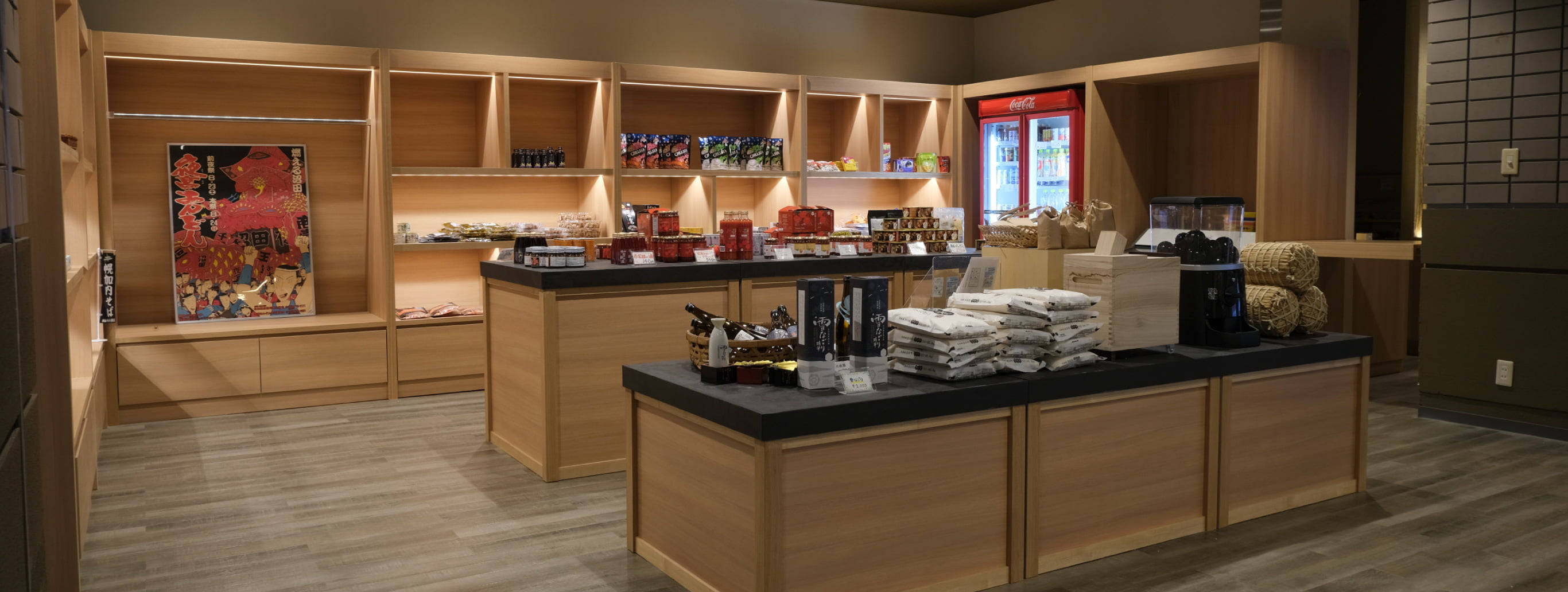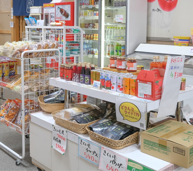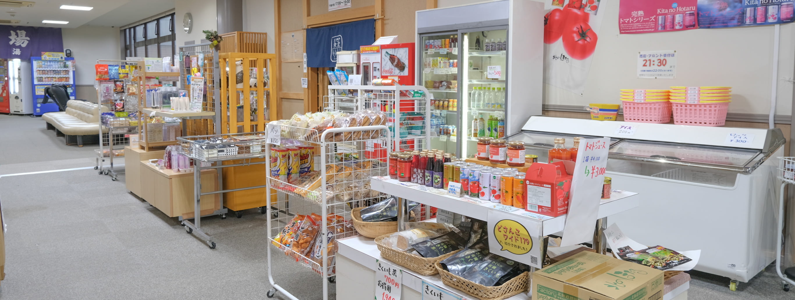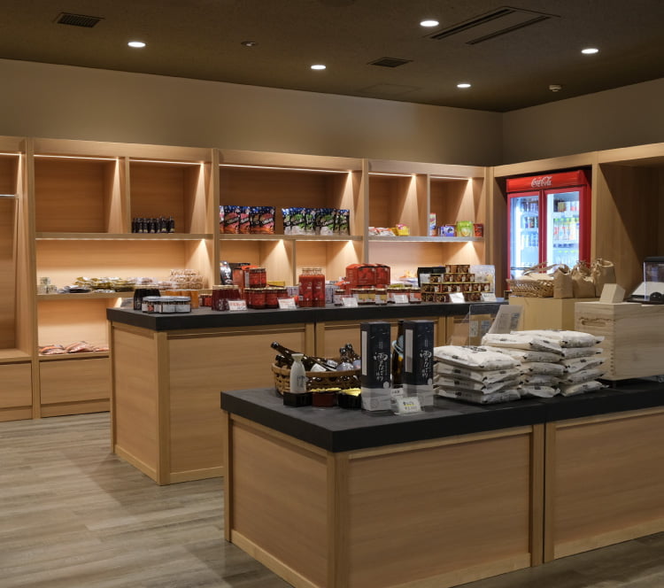 宿内でお土産や旅の品をお求めいただける売店です。地元の特産品や、お部屋で楽しめるお菓子なども取り揃えております。